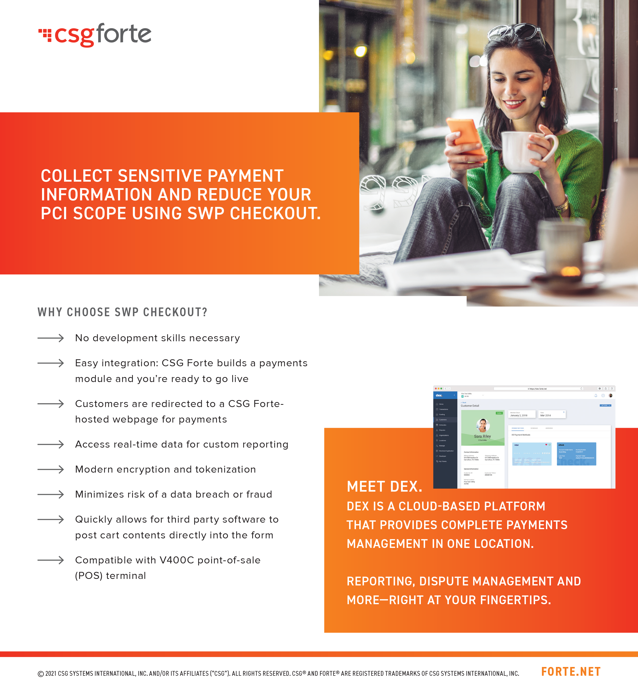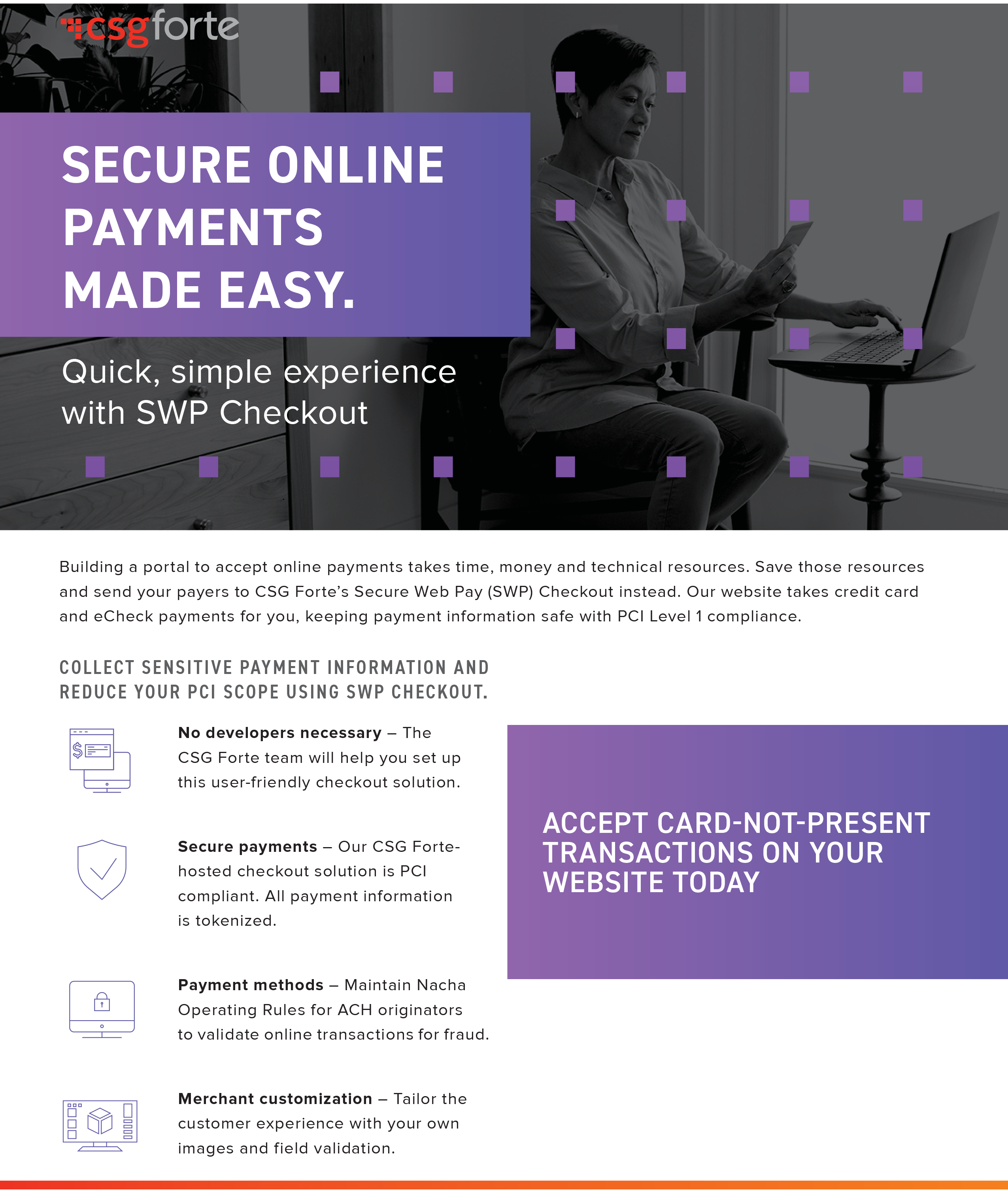 Download the Secure Web Page Checkout Datasheet © CSG Forte CSG Forte Payments, Inc. is a registered ISO of Wells Fargo Bank, N.A., Concord, CA NMLS # 1986669.